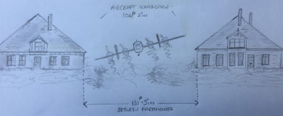 Het laat zien dat de afstand tussen de boerderijen aan de Oosthuizerweg ongeveer veertig meter is. De Halifax BB 329 mat net geen 32 meter. Een wonder of een staaltje extreme vliegers skills